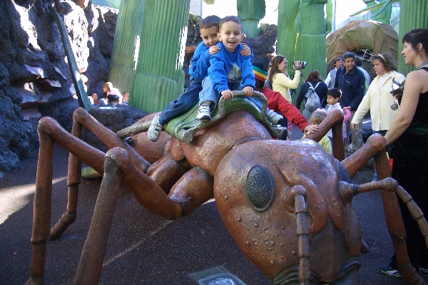In Honey, I Shrunk the Kids Movie-Set Adventure, we played on climbing nets, slides, and tunnels. Here, Avery & Brandon ride on a giant ant.