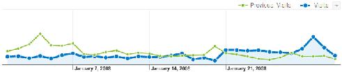 Two down months in a row. Clearly, I need to step up my game. In the “Behind Every Bad Report is a Good Excuse” category, I will note that I basically took the first two weeks of January off, as I was out of town with the family during that time. In fact, if you look at the daily graph (below) of visits per day, you’ll see that December (in green) had January (in blue) beat consistently for the first two weeks, then it became a horserace, and then January took over the lead.