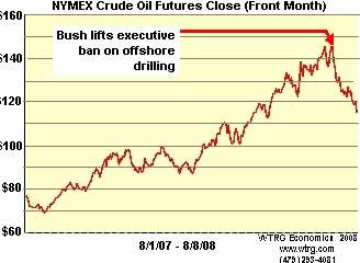 2) I don’t think the government’s action was meaningless, and the markets agree with me. Bush lifting the ban puts the U.S. a lot closer to offshore drilling than it was before, and speculators are in the business of managing risk (just like poker: if the turn gives you a draw, you’re more likely to bet on the river…).
