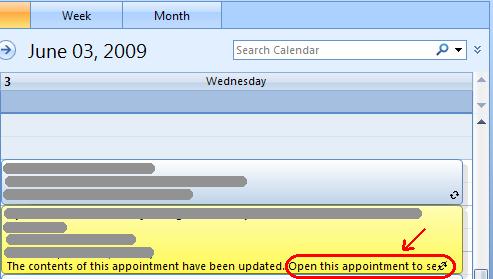 The Calendar view in Microsoft Outlook 2007 uses a clever set of icons to give the user key information about his/her meetings without opening each one. Recurring meetings, for instance, show up with curved arrows in the lower-right corner. If you modify a single instance of a recurring meeting, it puts a diagonal line through the arrows, which gives the unfortunate impression of a script “x”. Hence, you get meeting descriptions like this: